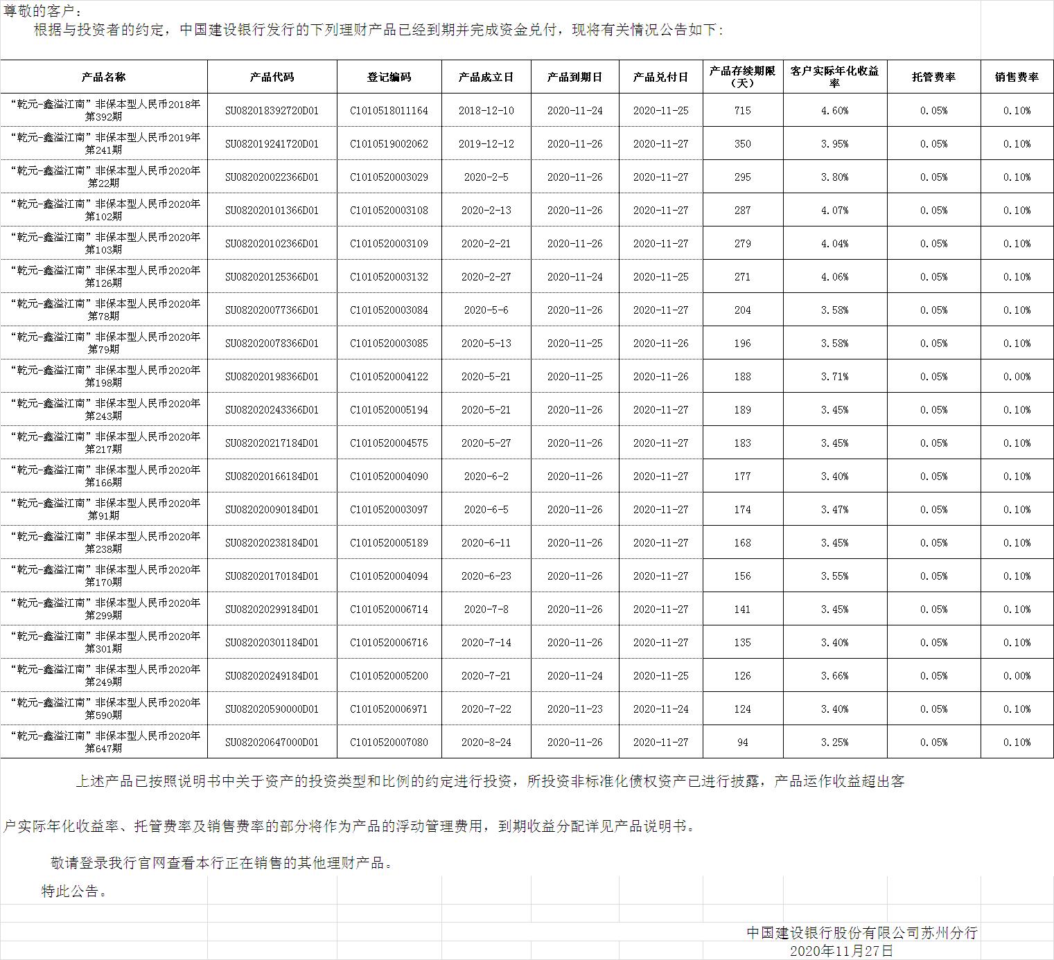 中国建设银行理财产品终止及清算公告