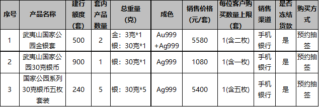 我行本次销售的具体产品包含3克金币+30克银币、国家公园系列30克银币5枚装(三江源、大熊猫、东北虎豹、海南热带雨林及武夷山五个国家公园纪念银币各1枚),合计3款商品,具体信息如下: